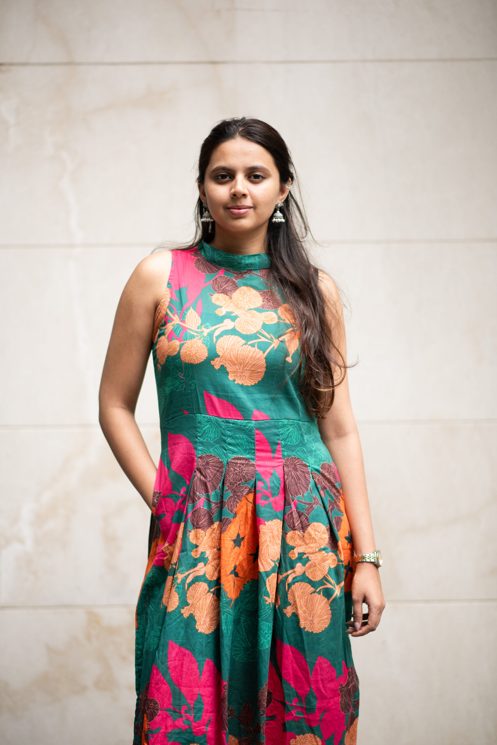 Bright, bold, and beautiful – this sleeveless forest green dress is adorned with vibrant floral prints in shades of orange, pink, and brown. The fitted bodice and flared pleated hemline create a flattering silhouette, while side pockets add a touch of functionality. Perfect for brunches, get-togethers, or casual evenings, this dress is a statement piece that blends comfort with charm