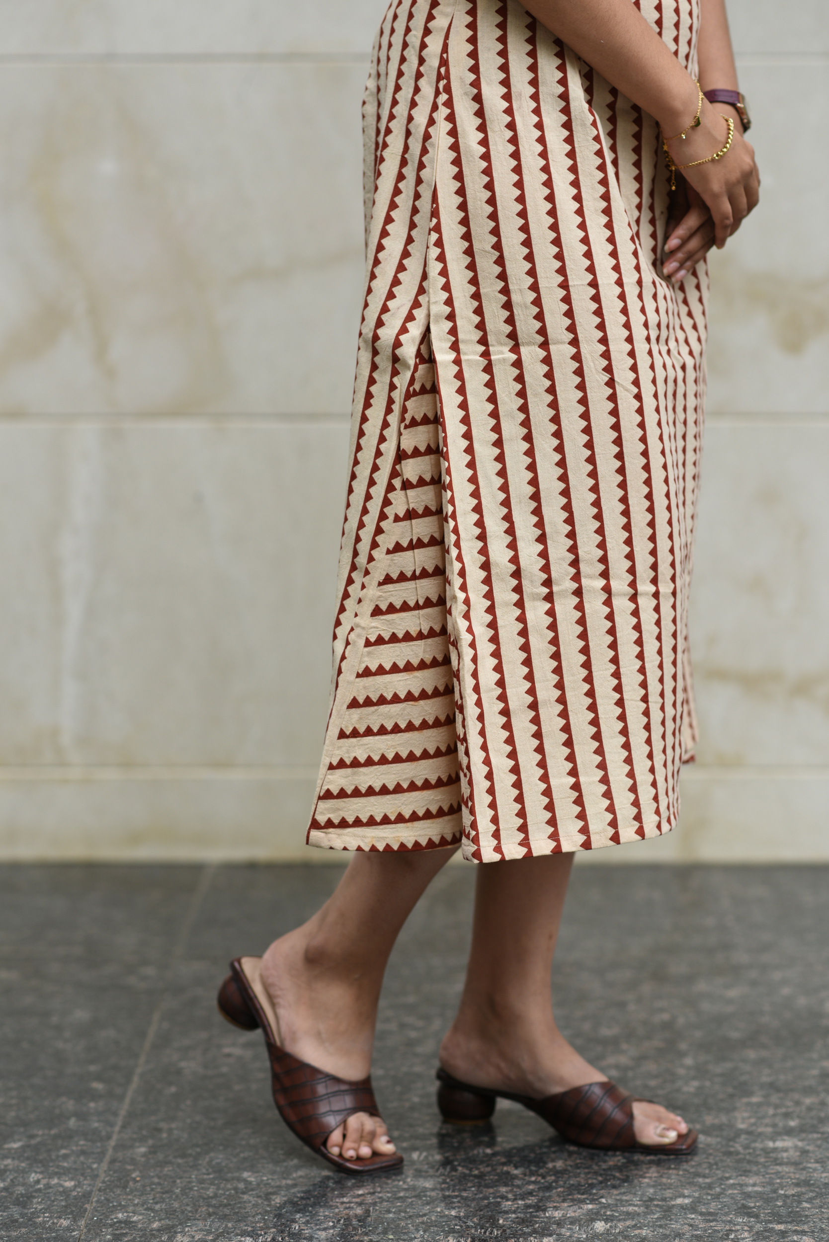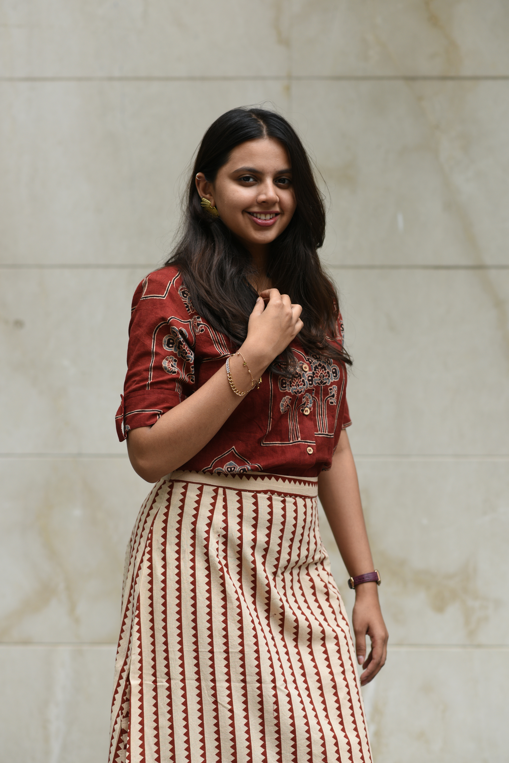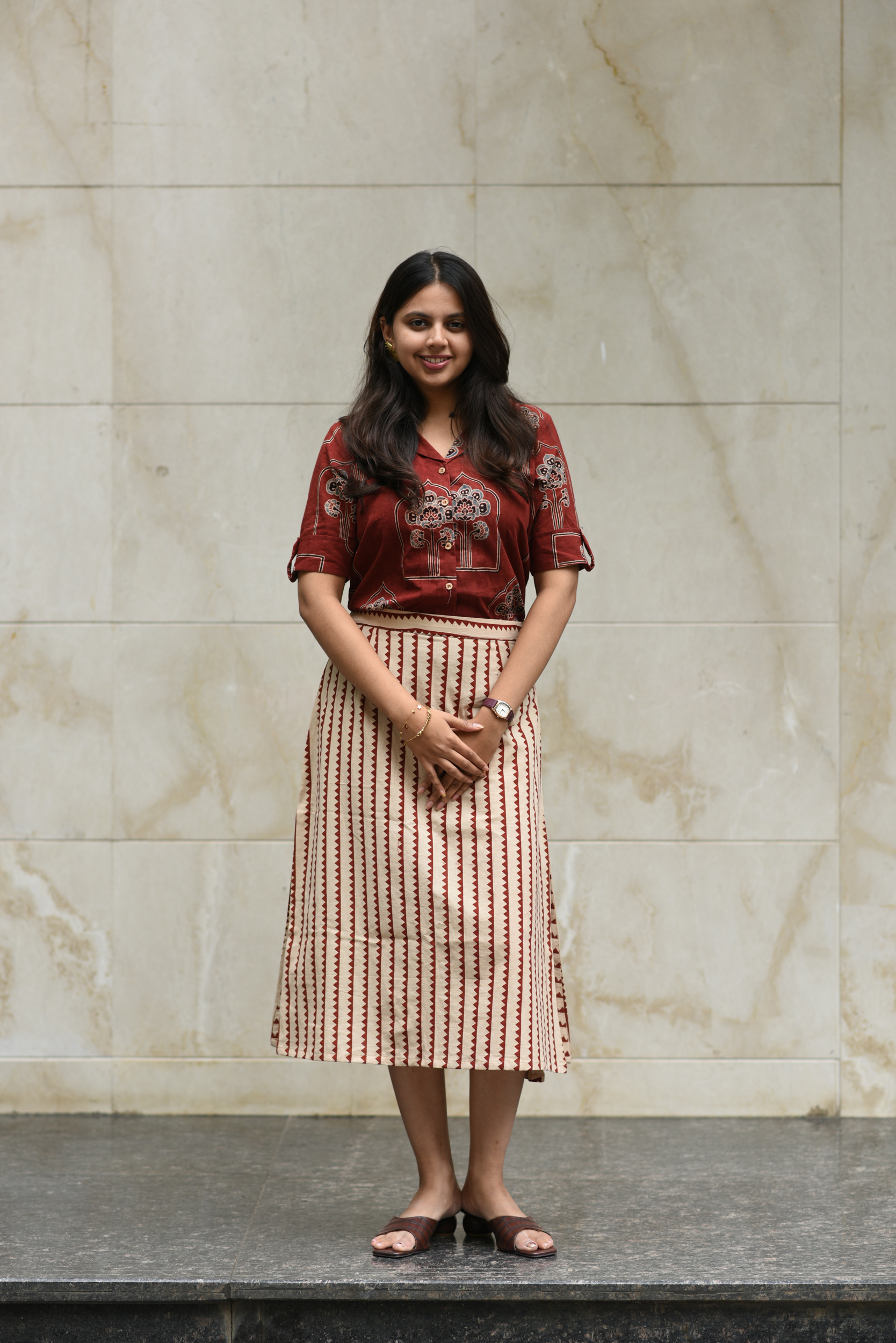 A perfect blend of tradition and ease — this look pairs a rust-red printed shirt featuring intricate motifs with a beige and maroon striped midi skirt. The earthy tones and handcrafted detailing lend it a vintage charm, while the contemporary silhouette keeps it effortlessly modern. Ideal for brunches, art walks, or laid-back festive gatherings.