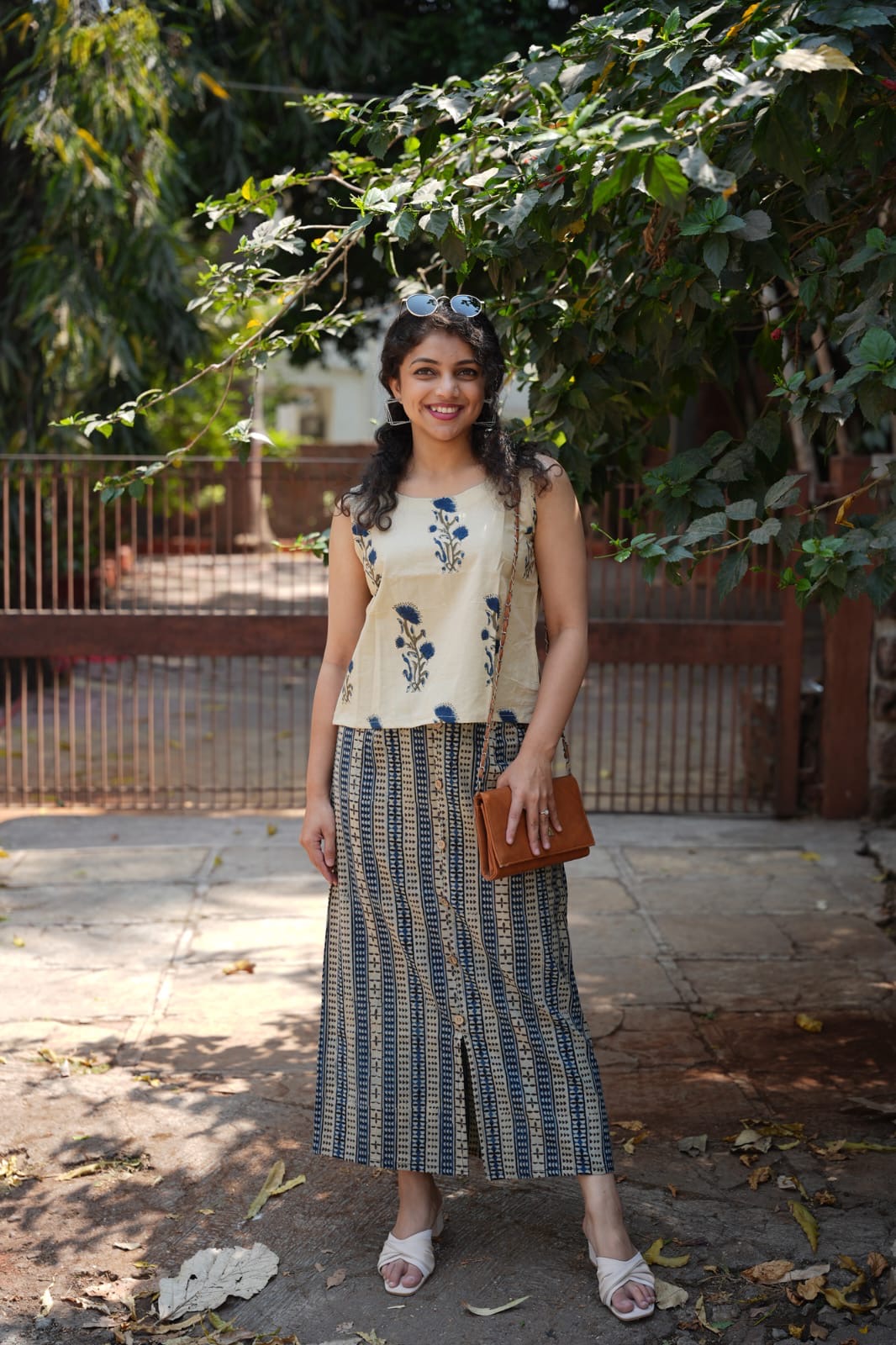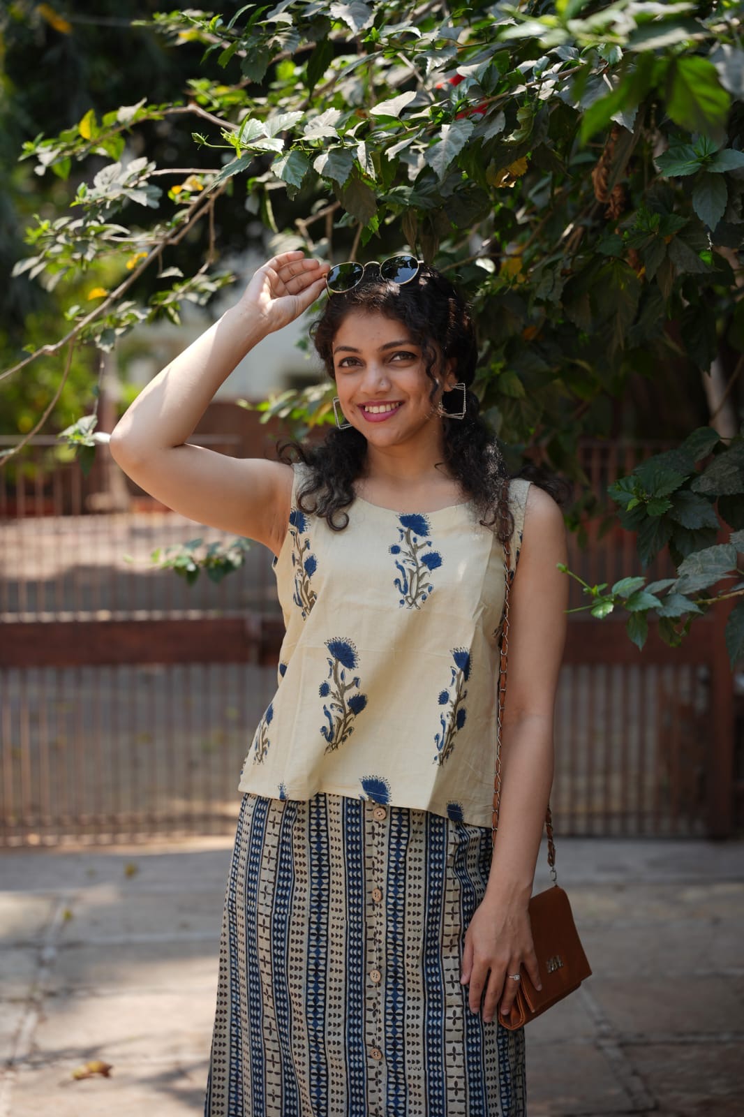 Elevate your everyday style with this elegant Ajrakh cotton skirt and handblock printed top set, crafted for women who love effortless comfort with timeless Indian craftsmanship. The sleeveless beige cotton top features delicate handblock floral motifs, while the coordinated Ajrakh print skirt showcases classic geometric patterns inspired by traditional artisan techniques.
