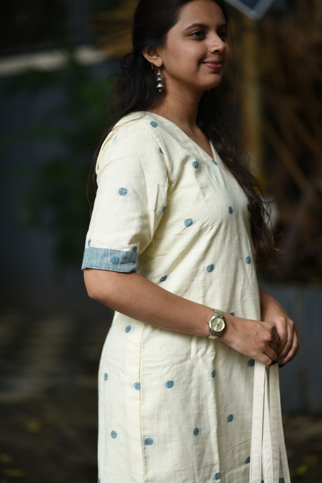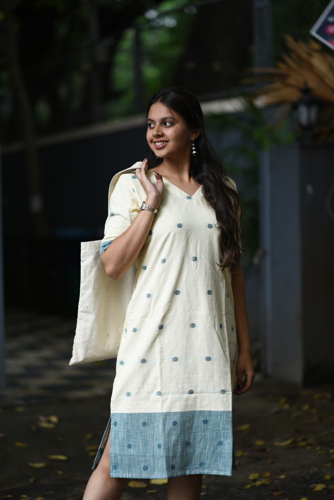 A graceful blend of simplicity and charm, this beige handloom dress features playful polka dots for a timeless appeal. Crafted from soft, breathable handloom fabric, it offers comfort without compromising on style. Perfect for casual outings, brunches, or relaxed gatherings, this dress brings effortless elegance to your wardrobe.