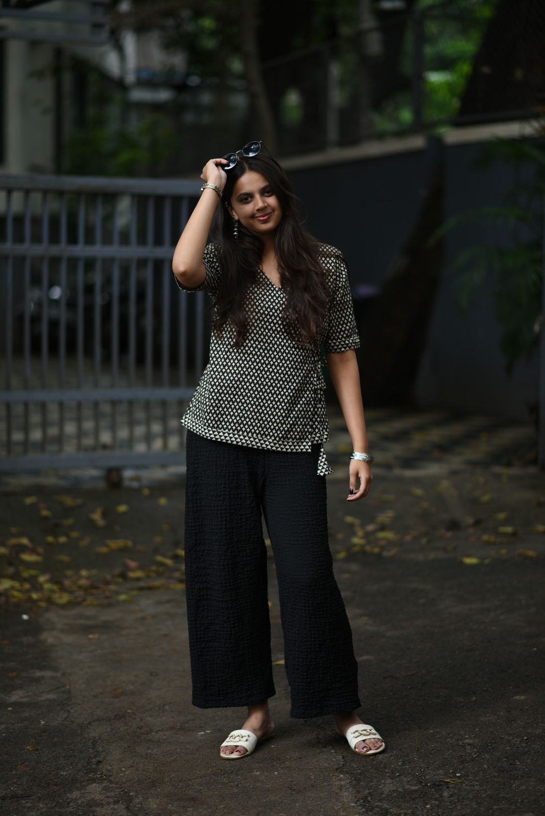 A chic addition to your wardrobe, this black wrap-around top features an all-over subtle print for a stylish statement. The adjustable wrap design flatters every silhouette, while the lightweight fabric ensures comfort throughout the day. Perfect for pairing with skirts, trousers, or jeans, it’s a versatile piece for both casual and semi-formal occasions
