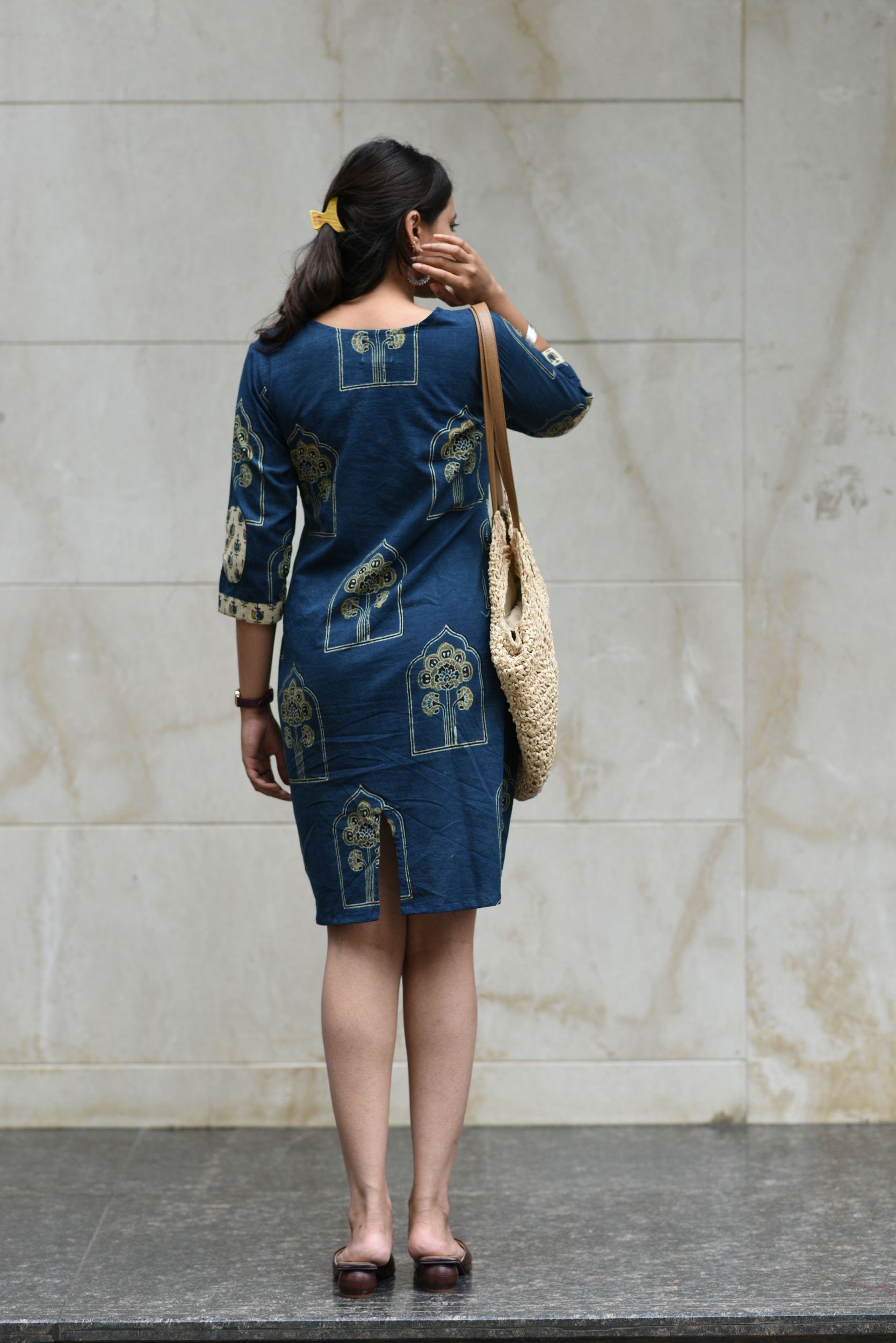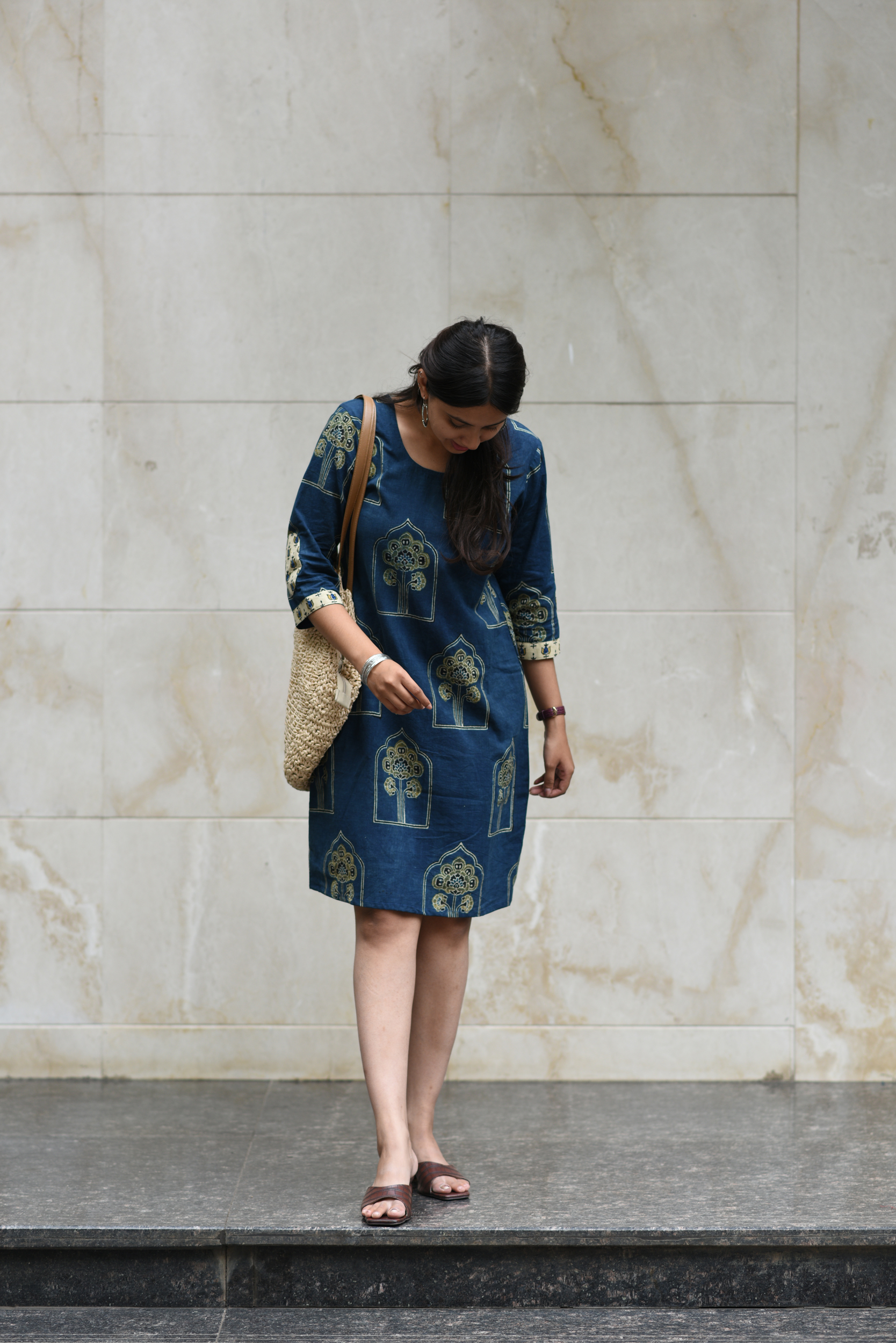 A serene indigo blue dress featuring hand block prints inspired by Mughal arches — a nod to timeless Indian craftsmanship. With its straight fit, subtle elbow patch and easy silhouette, this cotton dress is perfect for days when comfort and elegance go hand in hand.