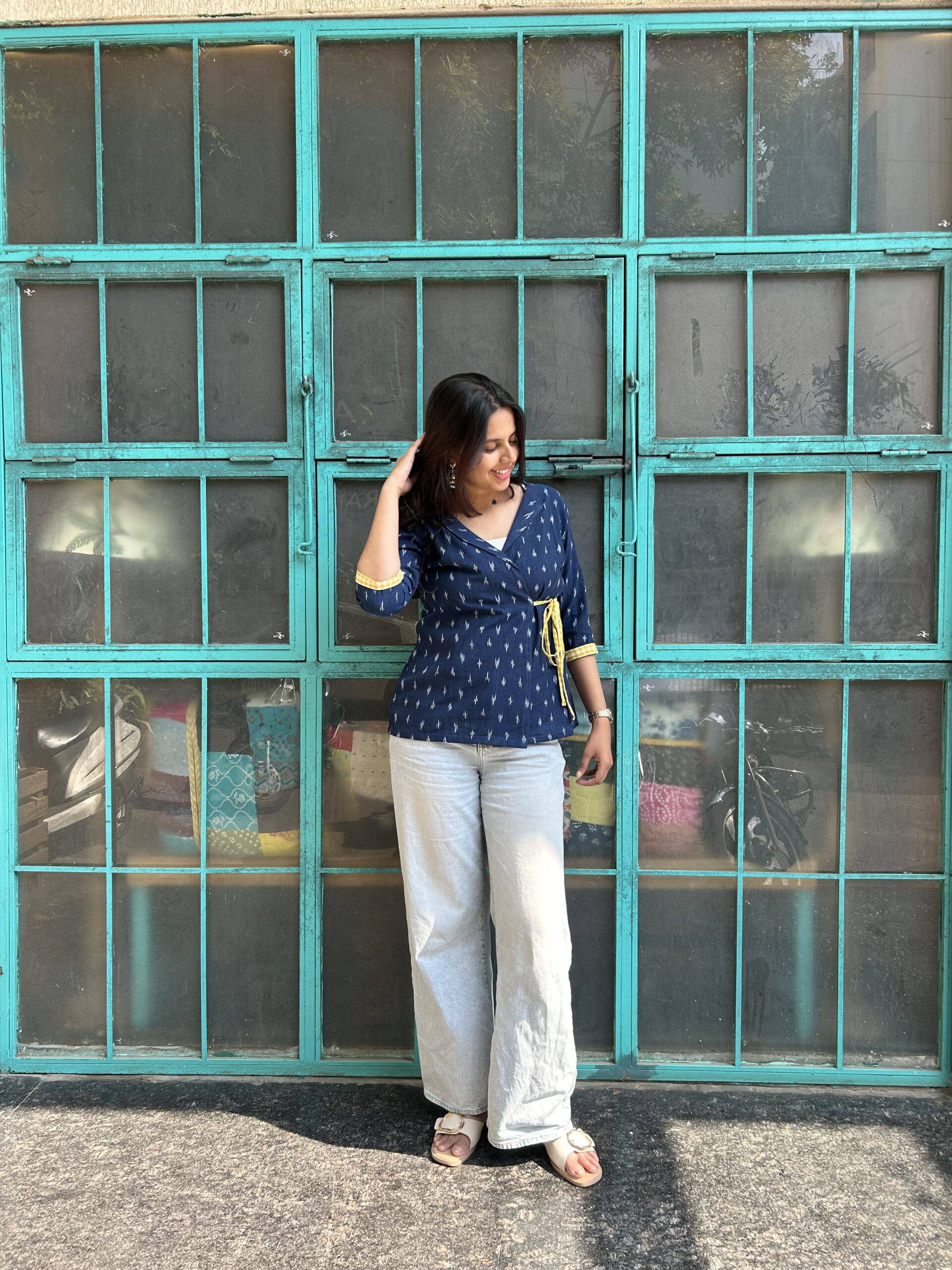 A timeless everyday essential crafted in breathable cotton ikat. This indigo wrap-style jacket features a soft overlap neckline, adjustable side tie-up, and relaxed 3/4th sleeves for effortless comfort. Finished with playful contrast checks on the sleeve cuffs and tie detail, it’s designed to flatter while keeping things easy and versatile.