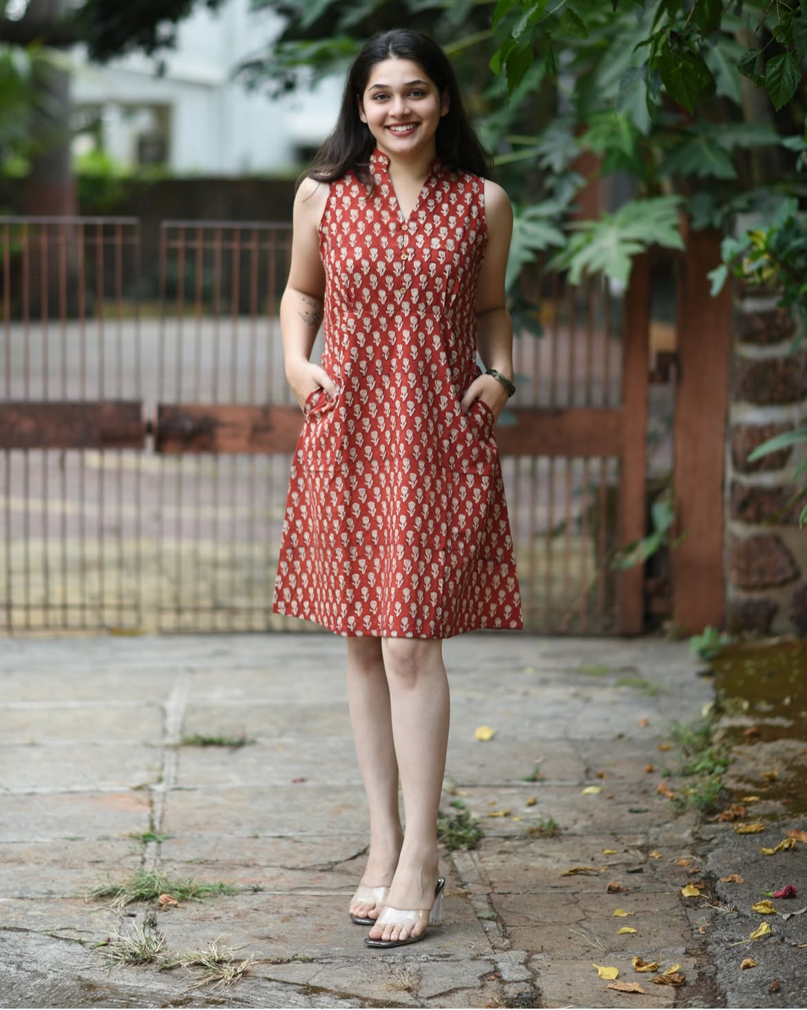Be the first to review “Brick Red Floral Dress With Mandarin Collar”