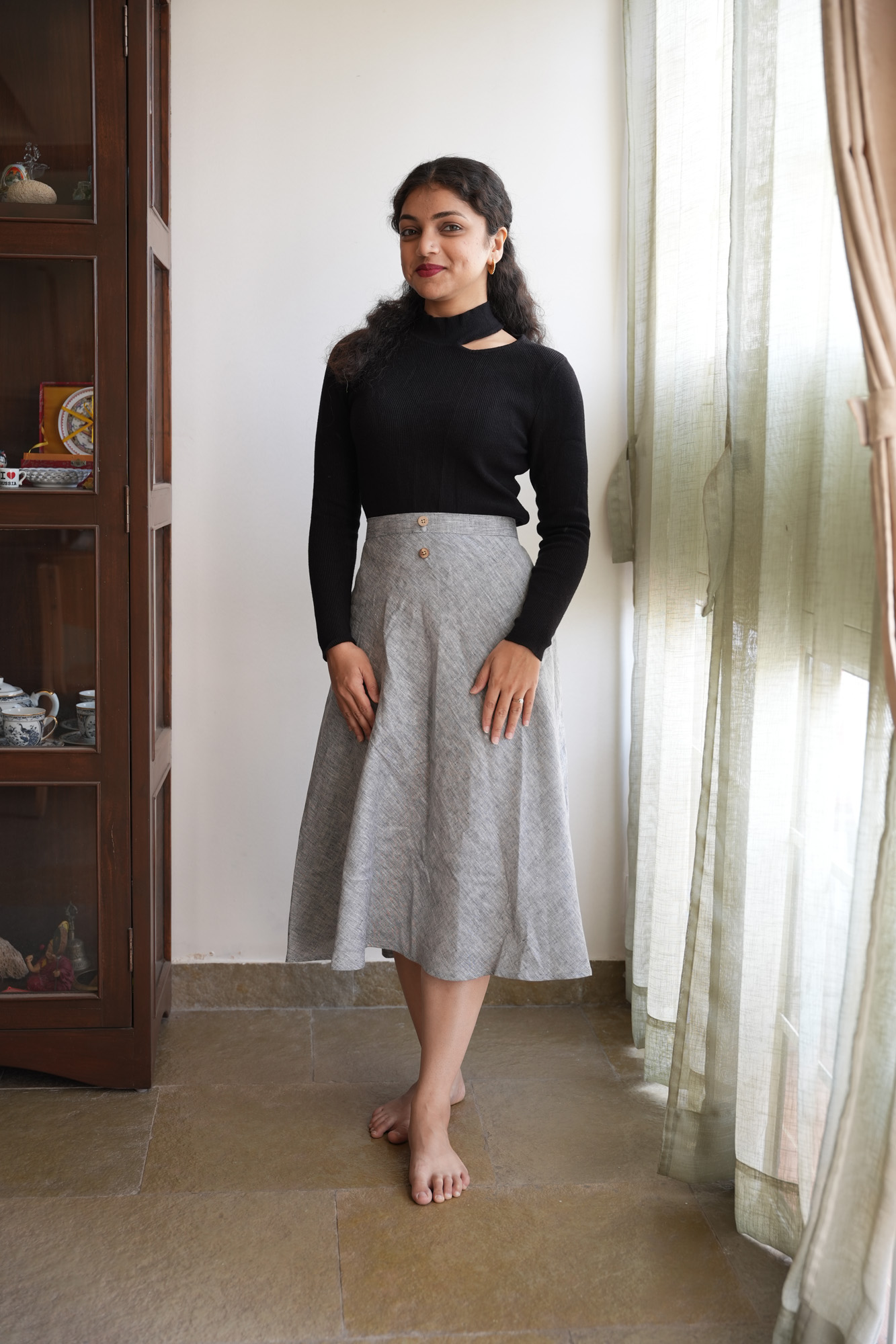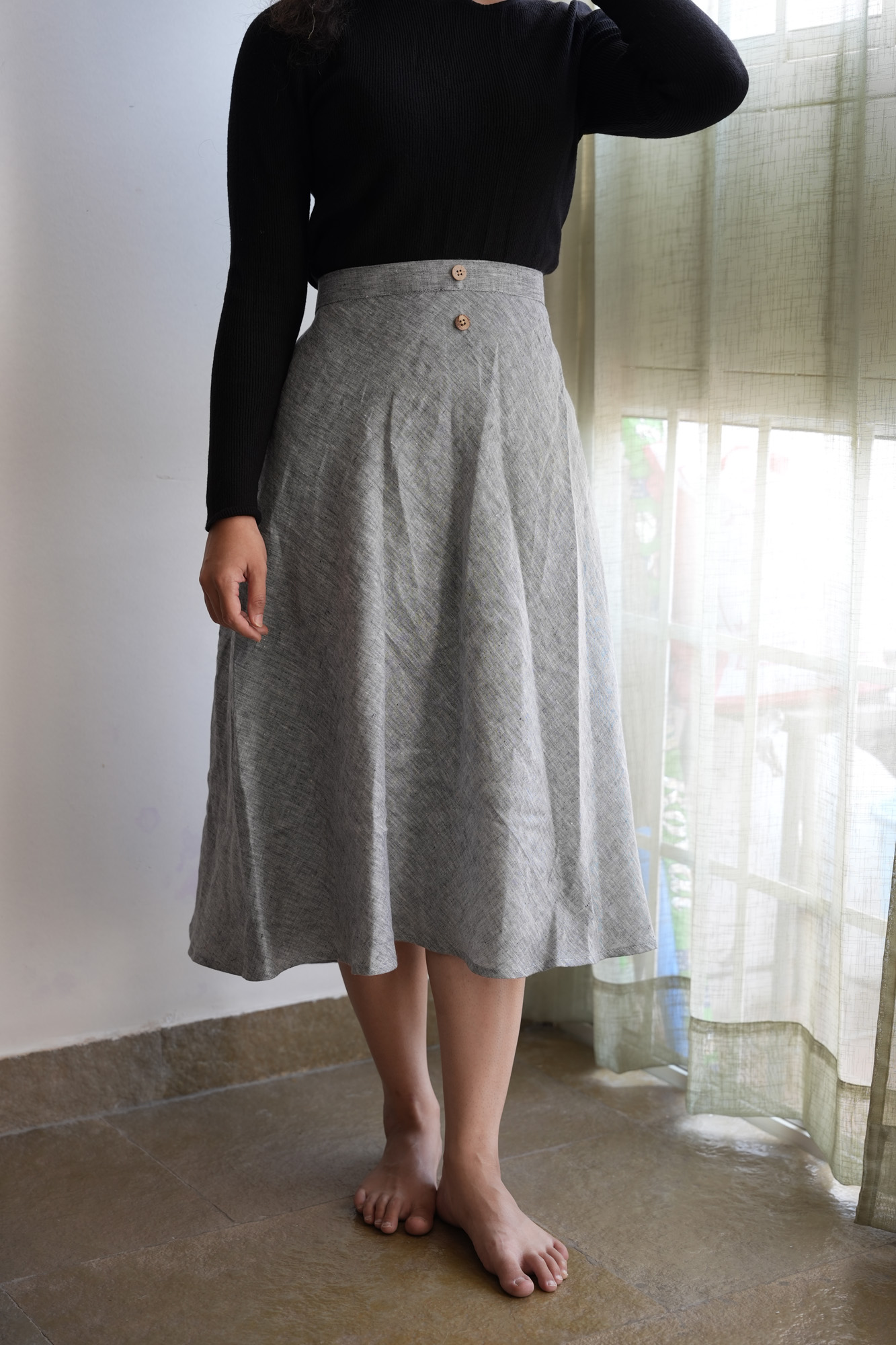 A timeless, minimal midi skirt crafted in a soft grey linen fabric, designed to fall gracefully with a gentle flare. The high-waisted silhouette is accentuated with a flare and finished with two earthy wooden buttons at the front, adding a touch of understated charm.