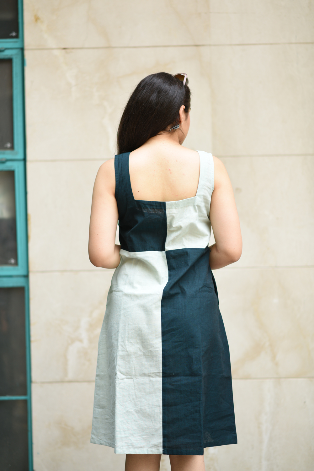A chic color-block sleeveless dress crafted in breathable cotton. The dress features contrasting panels arranged in a smart geometric pattern on the front and back. Designed with a square neckline and a knee-length cut, it offers a clean, contemporary silhouette. Perfect for casual outings, office wear, or a day out in the city, this versatile piece balances comfort with modern style.