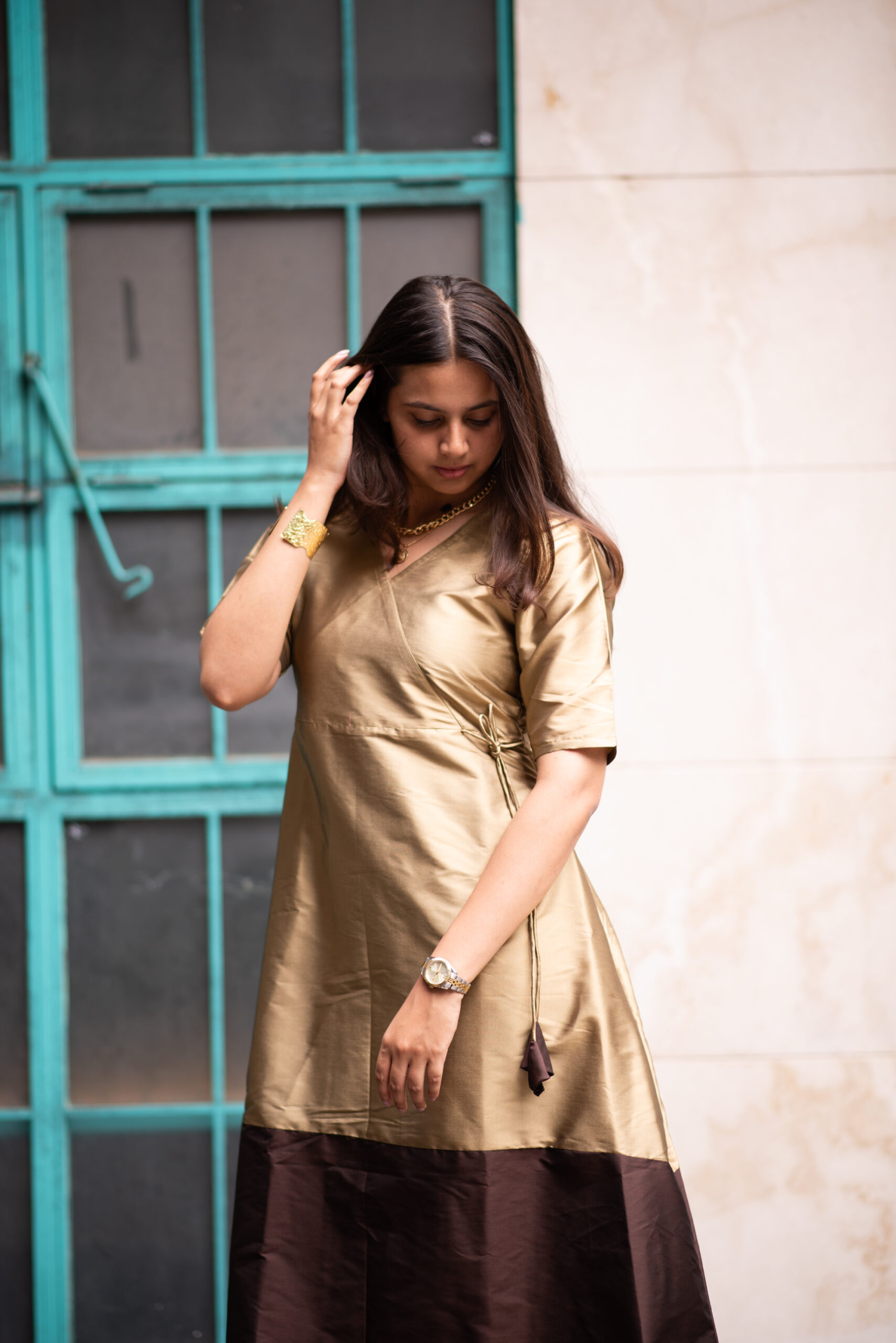 Golden brown silk faux wrap dress in tapeta silk. Lightweight, but very comfortable. material, super soft, but not heavy and still so fashionable doesn’t look slouchy. Perfect for summer season & Light winter season. It is a great choice for your wardrobe collection. This is the design which gives you perfect and stylish look whenever you wear it.