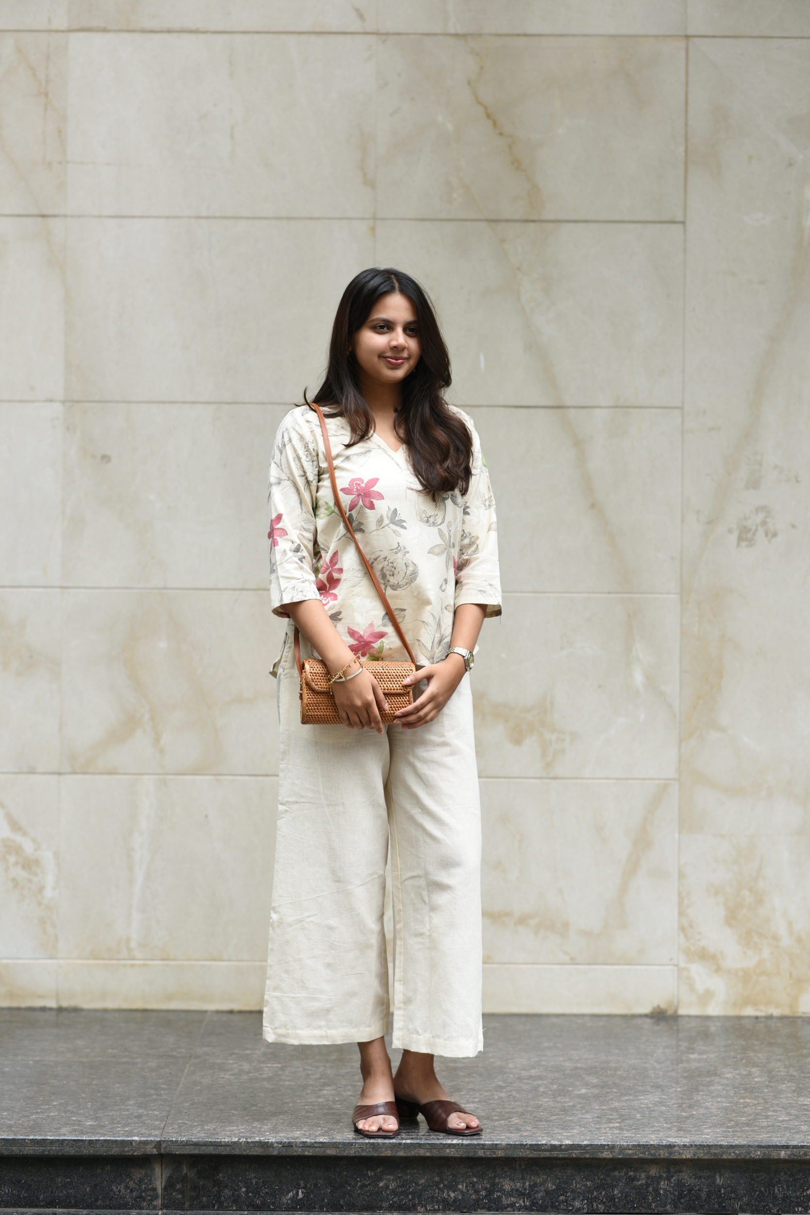 An elegant and earthy co-ord set that blends comfort with understated style. The outfit features a soft beige floral printed top with subtle pink and green botanical motifs, paired with wide-legged ivory pants for a breezy, effortless silhouette. The V-neckline and three-quarter sleeves add a relaxed charm, making it ideal for everyday wear or casual outings. Styled with a woven tan sling bag and simple flats, this look captures easy sophistication — perfect for brunch dates, travel, or a serene day out.