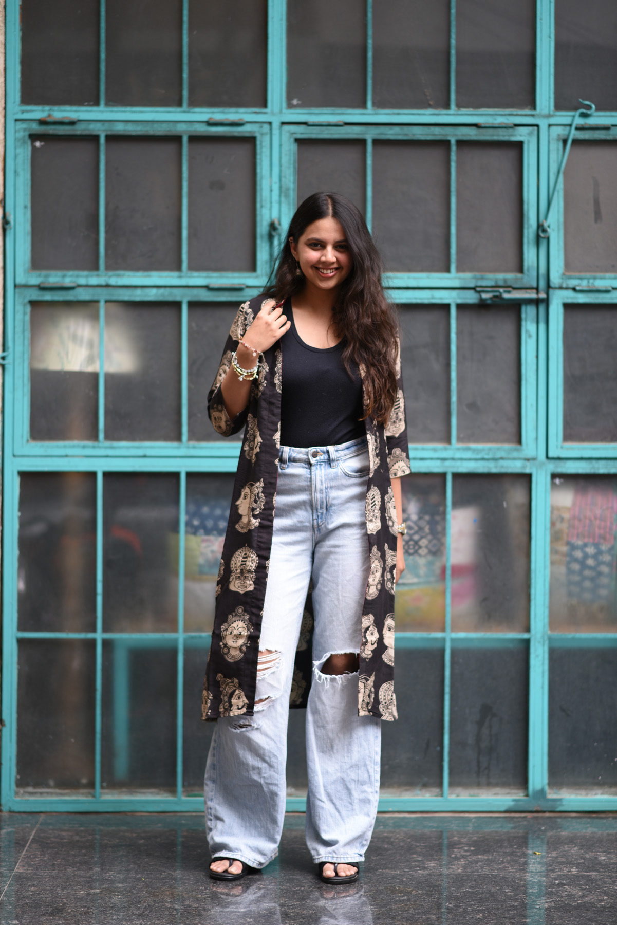 Add a touch of artistic charm to your wardrobe with this black overlay featuring an abstract face print. Crafted in lightweight fabric, it’s perfect for layering over dresses, tops, or kurtas. The relaxed silhouette and contemporary print make it a versatile piece that transitions seamlessly from casual outings to evening gatherings