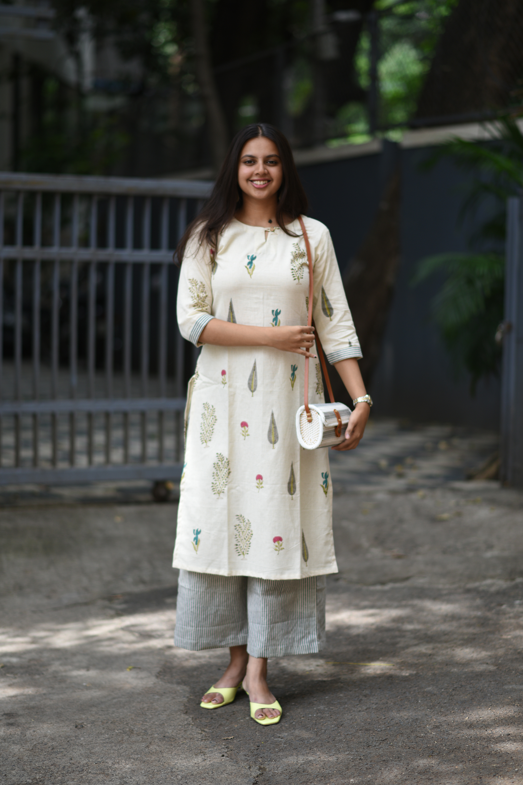 Flex printed floral motifs on a kurta and striped pants for all day long comfort whether during work or leisure.