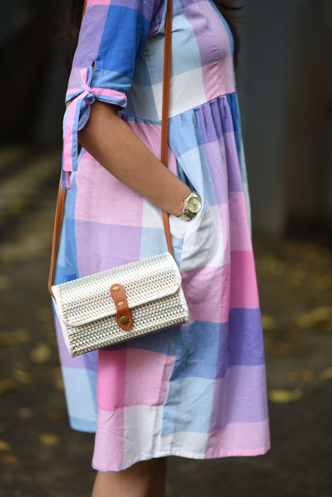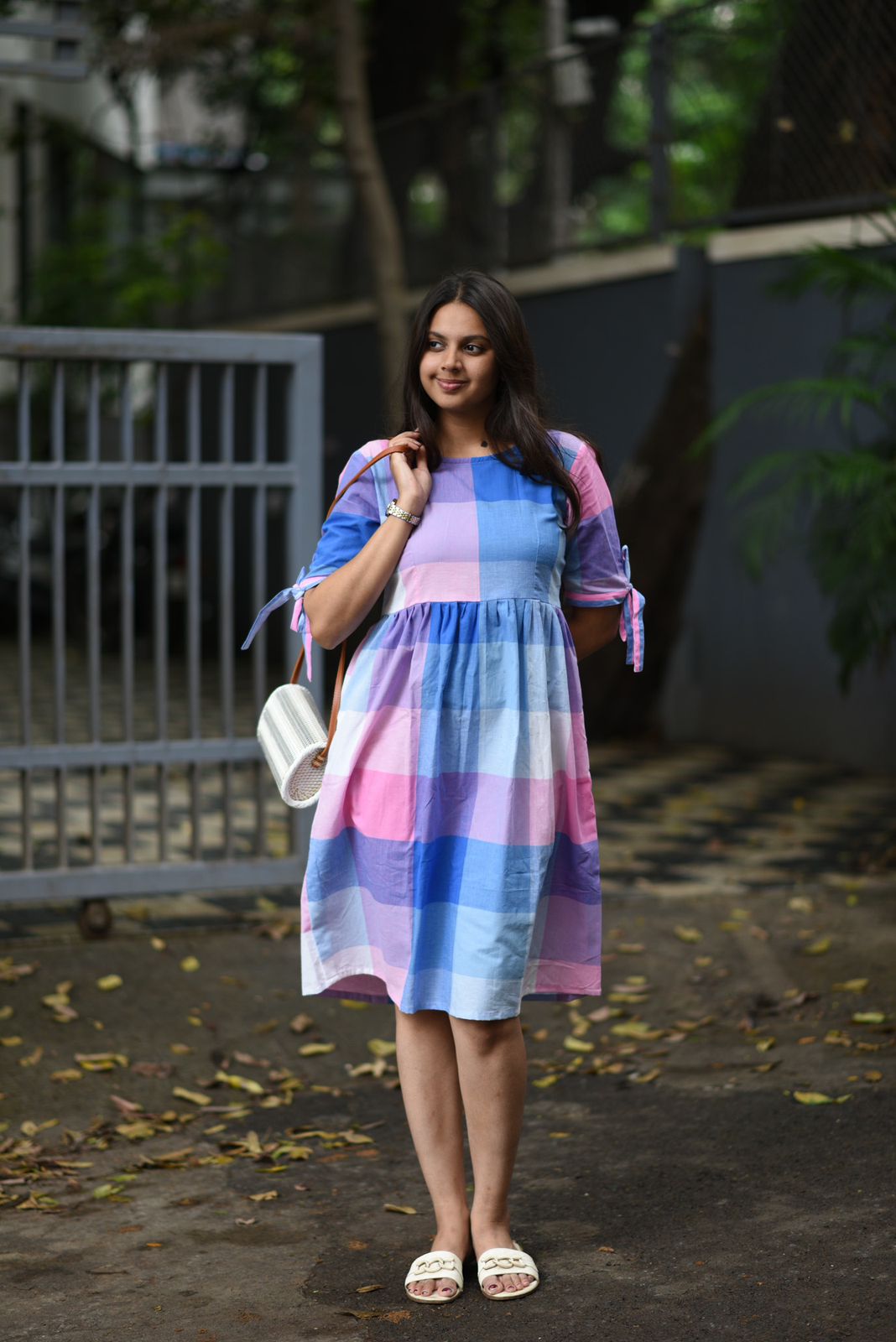 Fresh, playful, and effortlessly chic, this fit-and-flare dress features a classic gingham pattern in blue, pink, and white. The flattering silhouette cinches at the waist and flares gently, creating a graceful, feminine look. Crafted from comfortable, breathable fabric, it’s perfect for brunches, casual outings, or daytime celebrations.