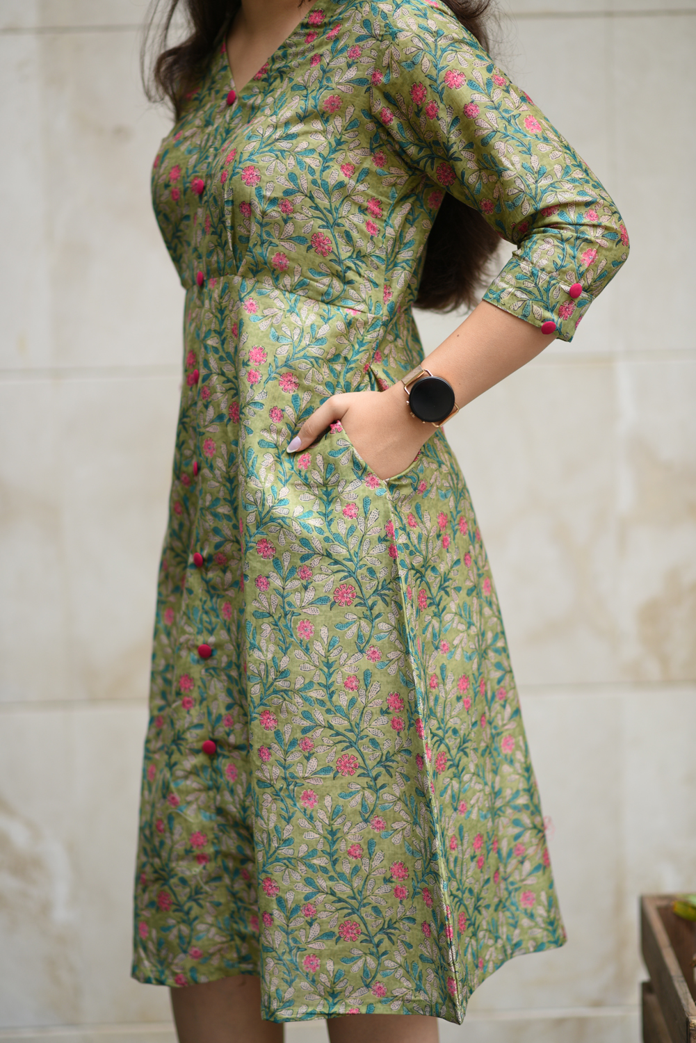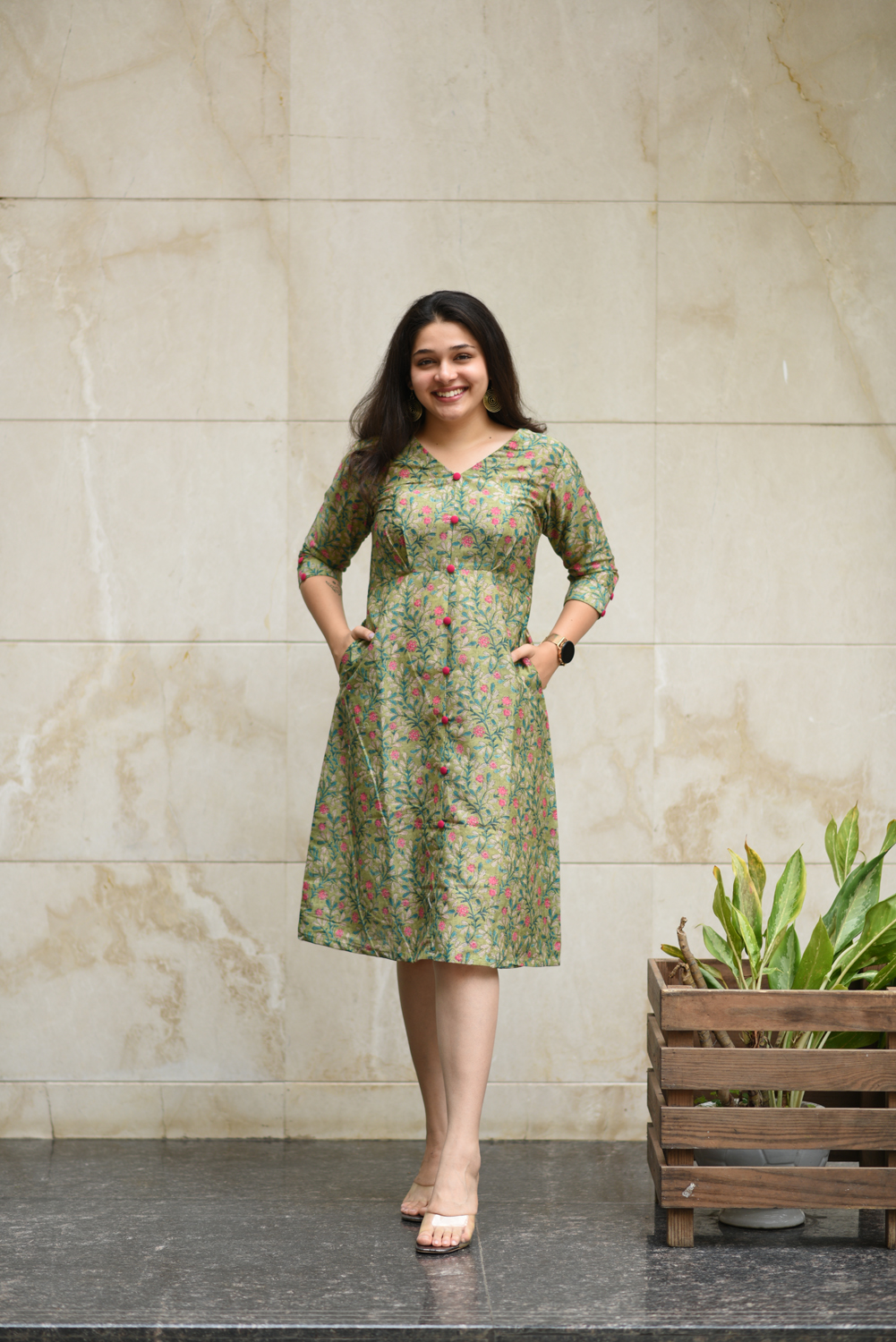 Light green chanderi modal button down dress with pockets to make your dull days brighter.