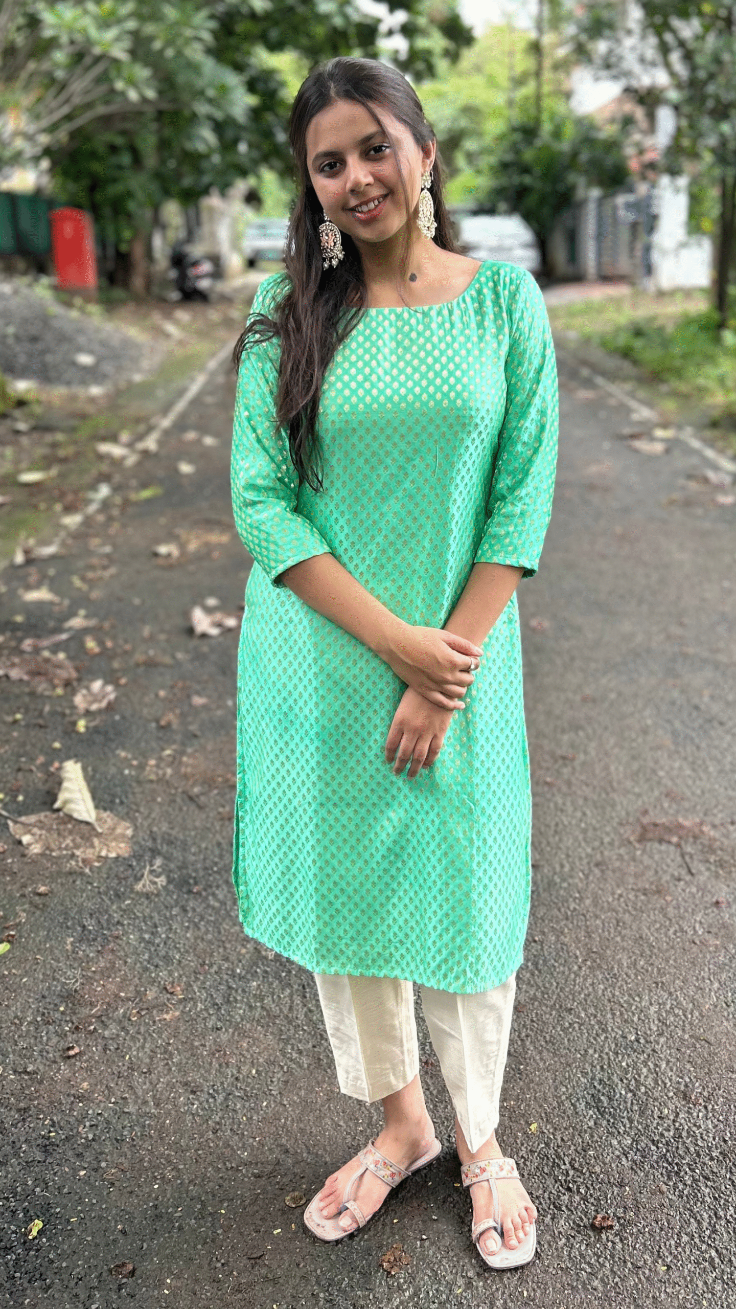 Graceful and timeless, this mint green Banarasi kurta paired with ivory pants is the perfect balance of elegance and comfort. Crafted in rich Banarasi silk blend, the kurta features delicate woven motifs that reflect heritage artistry, while the ivory straight pants add a subtle contrast for a refined look.