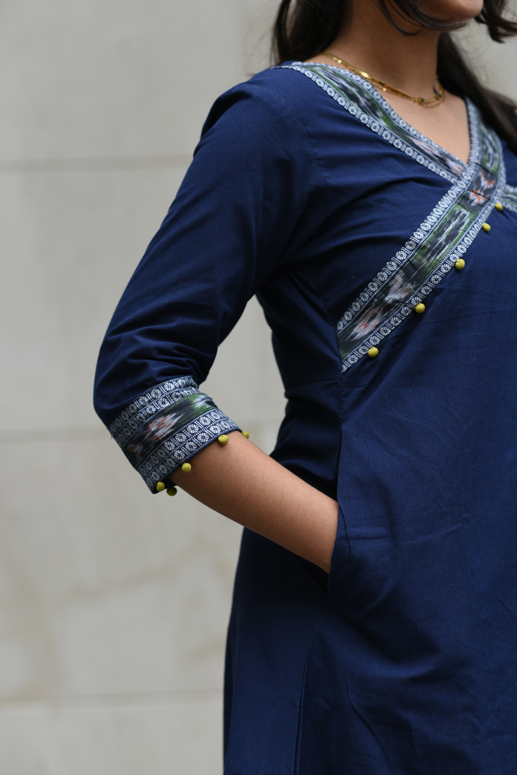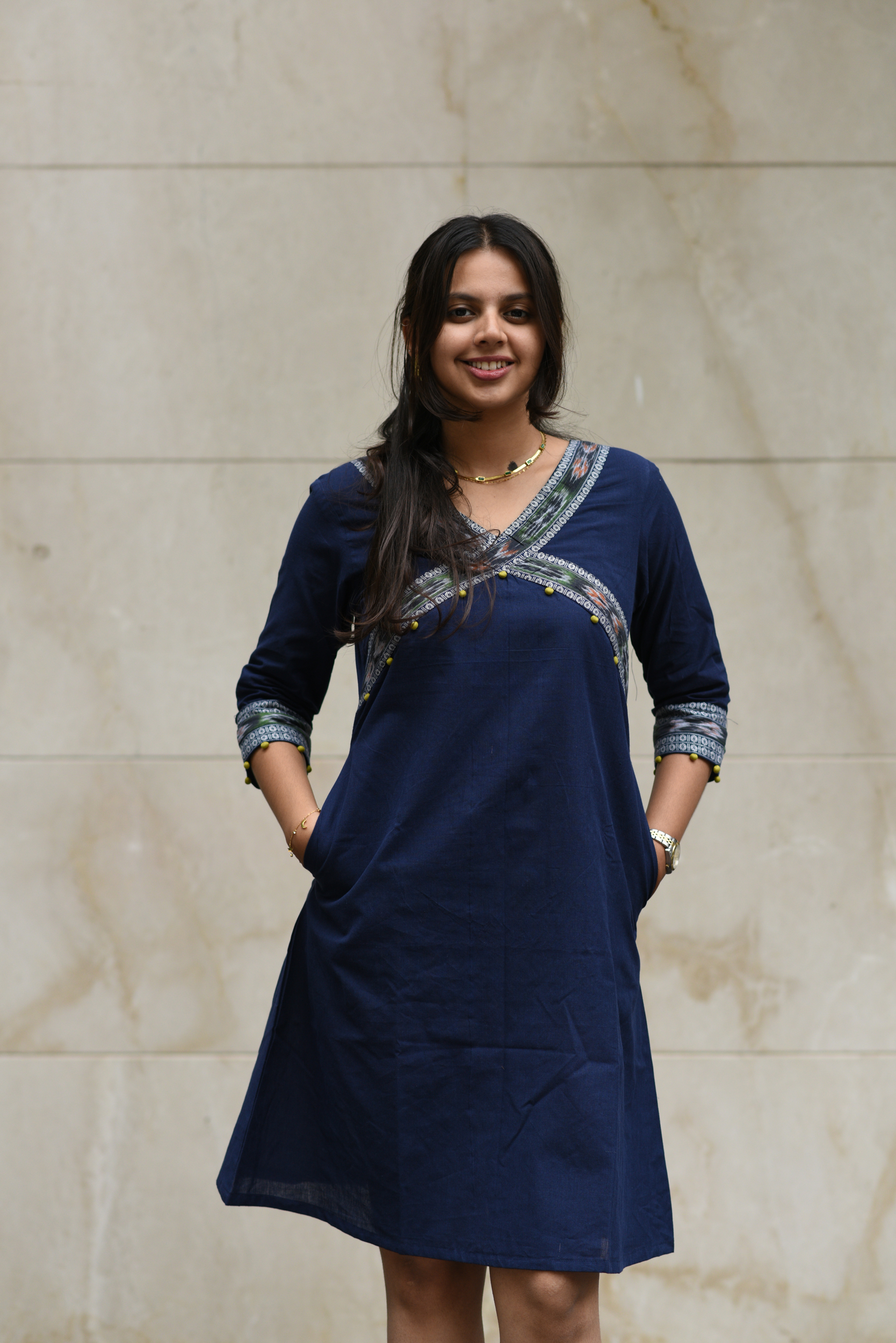 A deep navy blue cotton dress highlighted with handwoven borders and potli details along the neckline and sleeves. The A-line silhouette and easy pockets make it a perfect mix of elegance and comfort — ideal for casual outings, workdays, or travel days when you want to feel effortlessly put together.