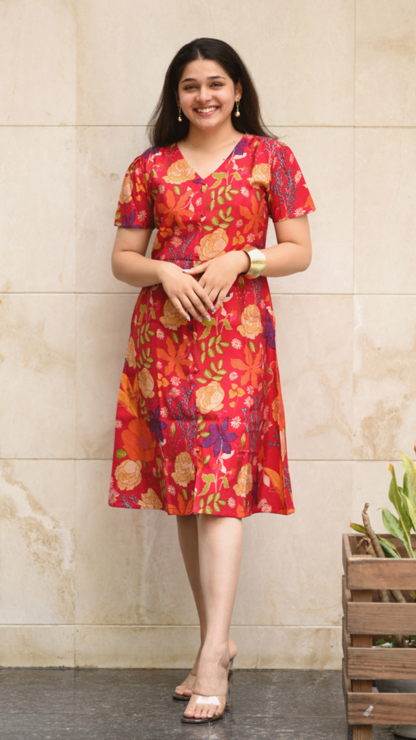 Effortlessly elegant, this pink floral dress is crafted from soft modal chanderi fabric, known for its lightweight feel, subtle sheen, and graceful drape. The floral prints add a touch of freshness, making it perfect for both day and evening occasions. Designed with comfort and sophistication in mind, this dress blends traditional charm with modern style.