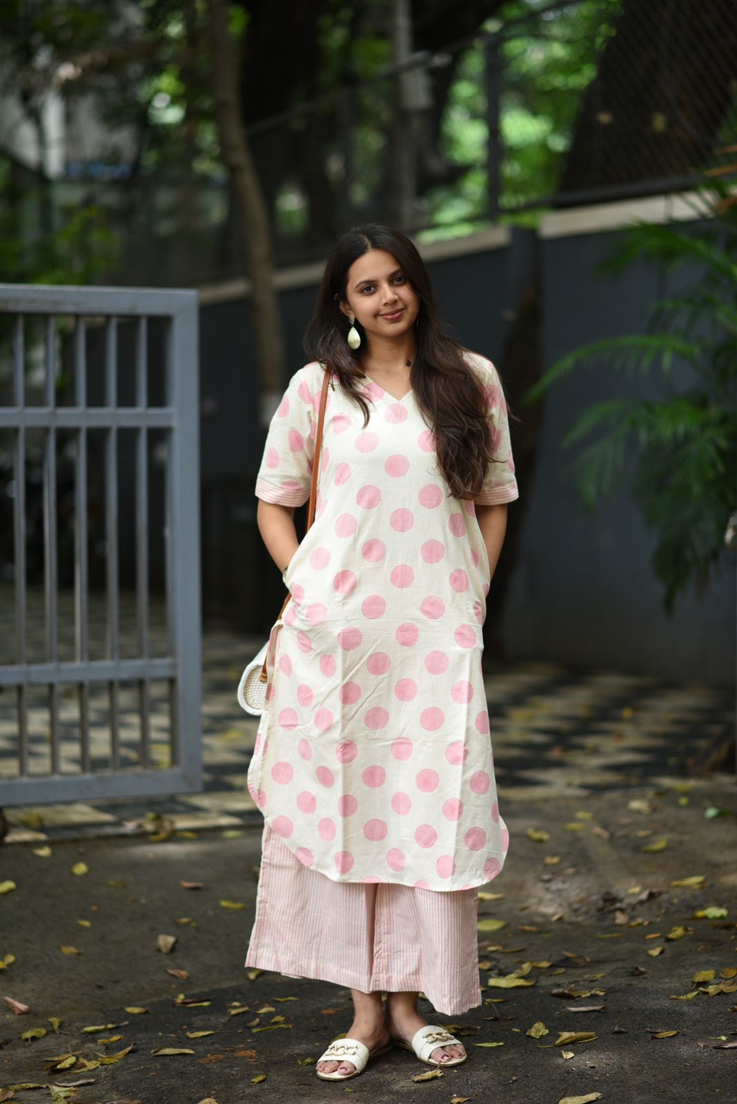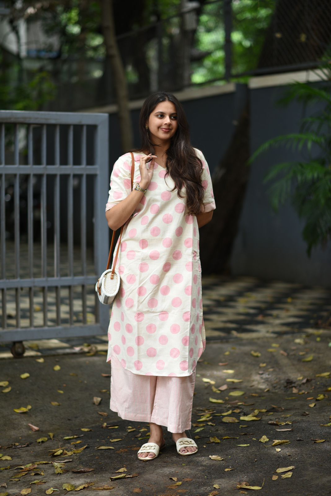 This charming blush pink kurta features playful polka dots and a flattering apple cut, creating a delicate, feminine silhouette. Paired with matching blush pink striped pants, the set blends comfort and style effortlessly. Perfect for casual gatherings, festive occasions, or day-to-day wear, it brings a fresh, elegant look to your wardrobe.