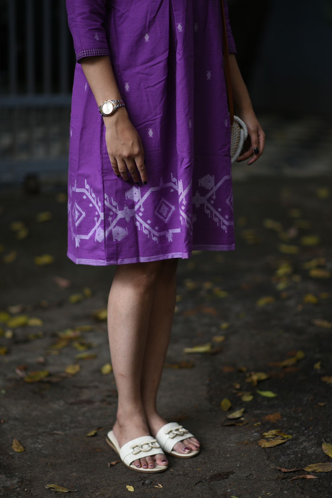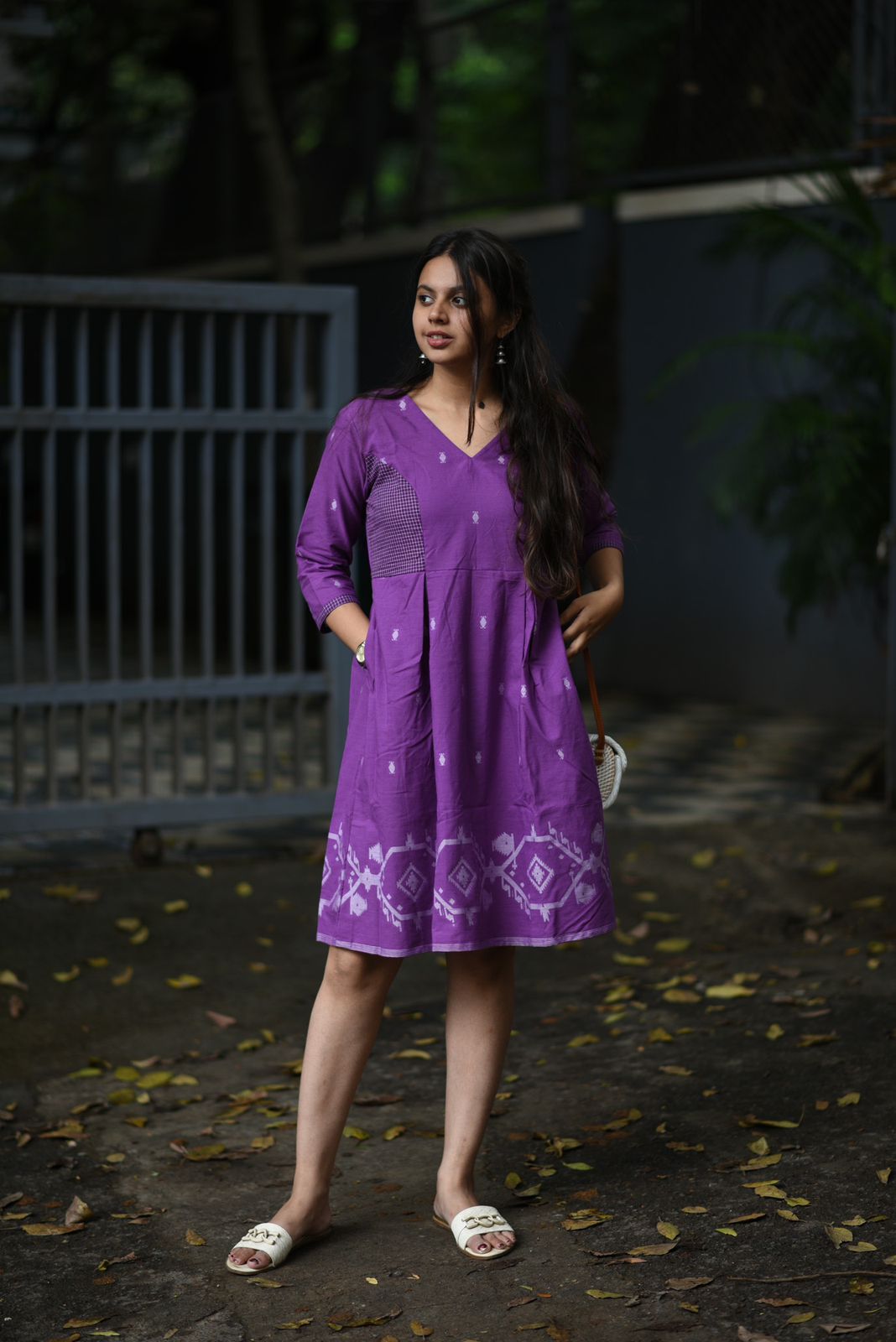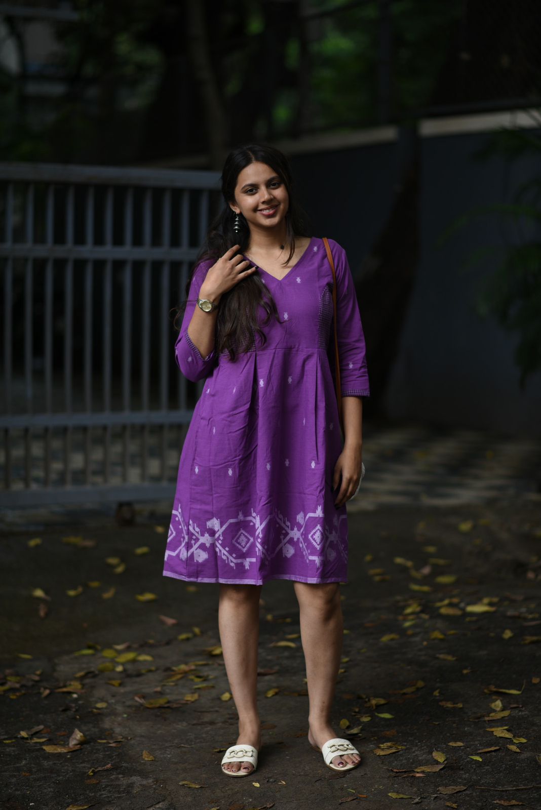 A perfect balance of tradition and modern tailoring, this purple Jamdani dress features classic check patterns crafted in fine handwoven fabric. Styled in a flattering princess cut with elegant scissor pleats, it drapes beautifully to create a graceful silhouette. Ideal for both festive occasions and casual chic outings, this piece blends heritage charm with contemporary design