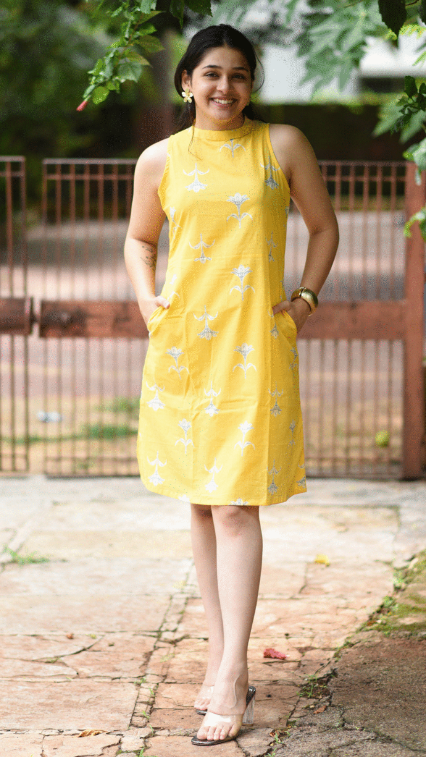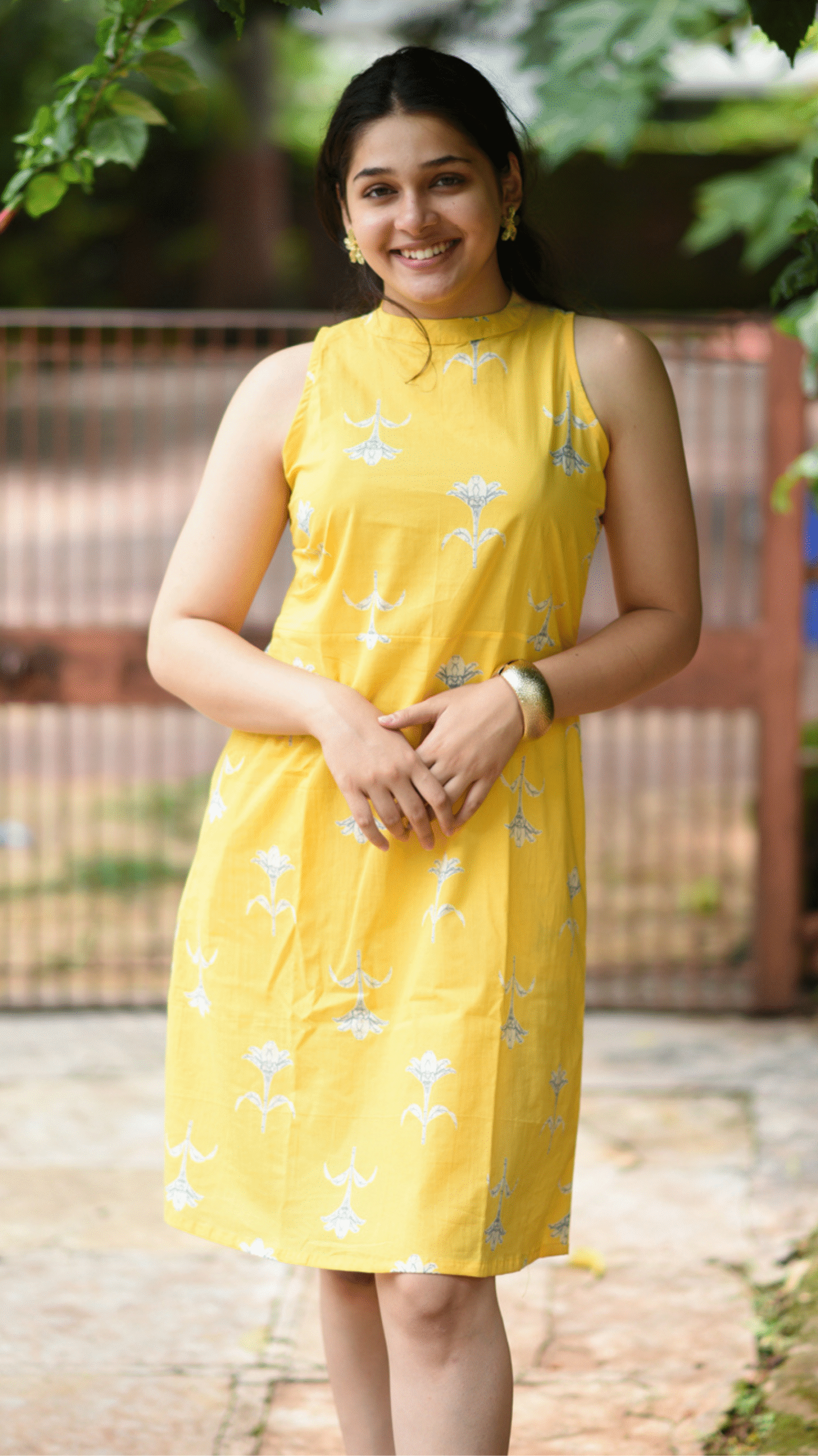 Brighten up your wardrobe with this cheerful yellow sleeveless dress, crafted in pure cotton for unmatched comfort. The breathable fabric keeps you cool through the day, while the lively prints add a playful, summery vibe. With its easy silhouette and sleeveless design, this dress is a perfect blend of style and ease.